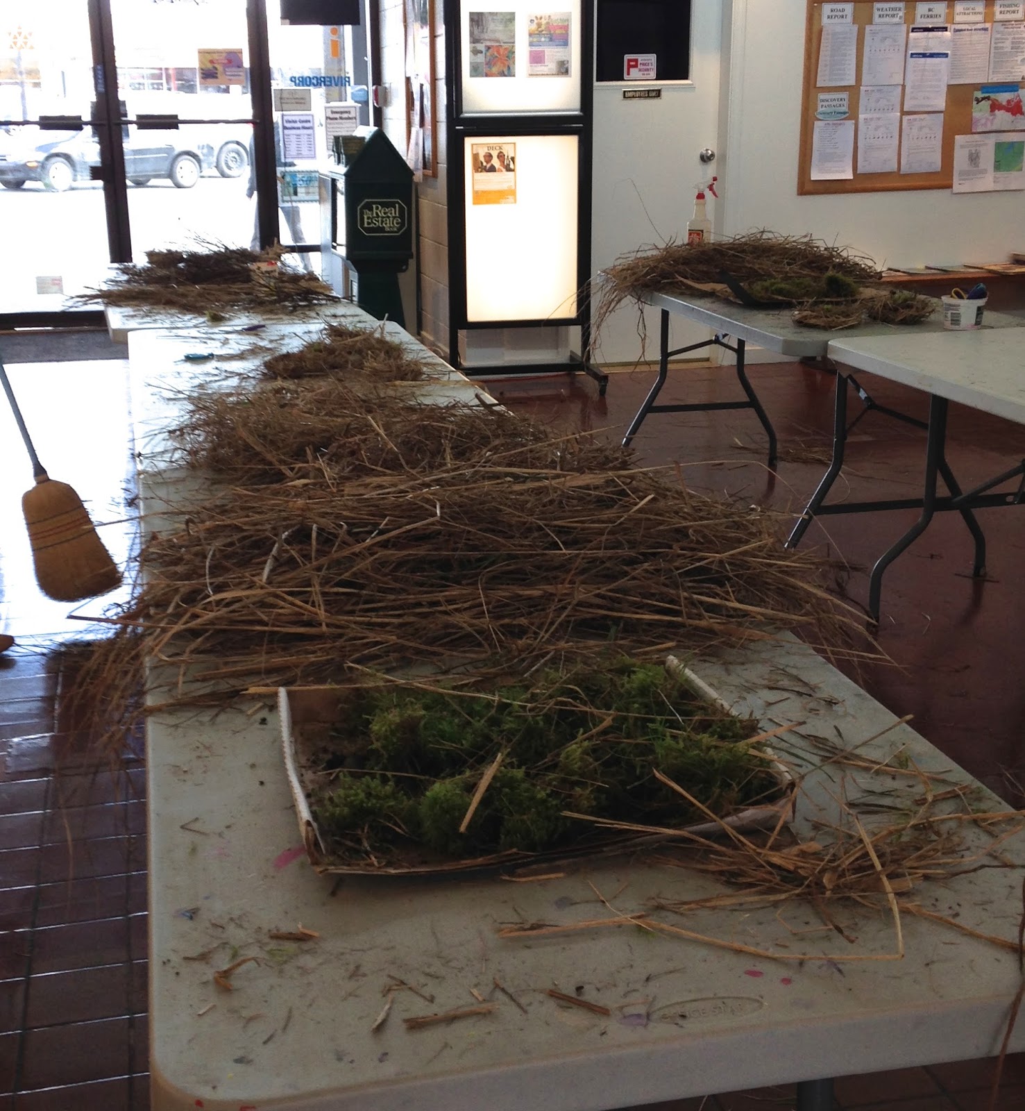 Quite a lot of people came out to build a nest and that was great because they were quick, easy and fun. We set up in the lobby of the Campbell River Art Gallery for easy access and clean up. This project would be great to do outside.